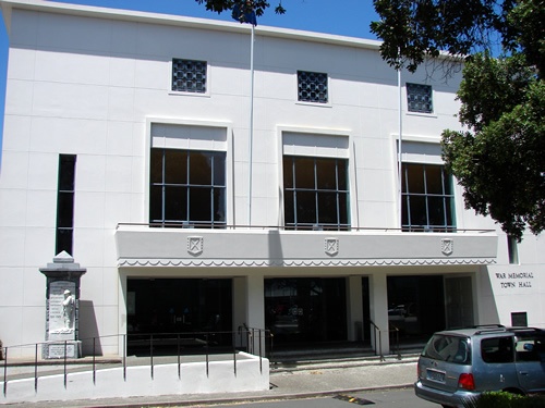 Unlike other such public halls in the vicinity, the hall was built solely as a Second World War memorial. However, in 1980 the central pillar of the Pukekohe First World War memorial gates was relocated from Roulston Park to a new site beside the town hall’s main entrance so that Pukekohe’s civic Anzac Day service could be held on the one site.